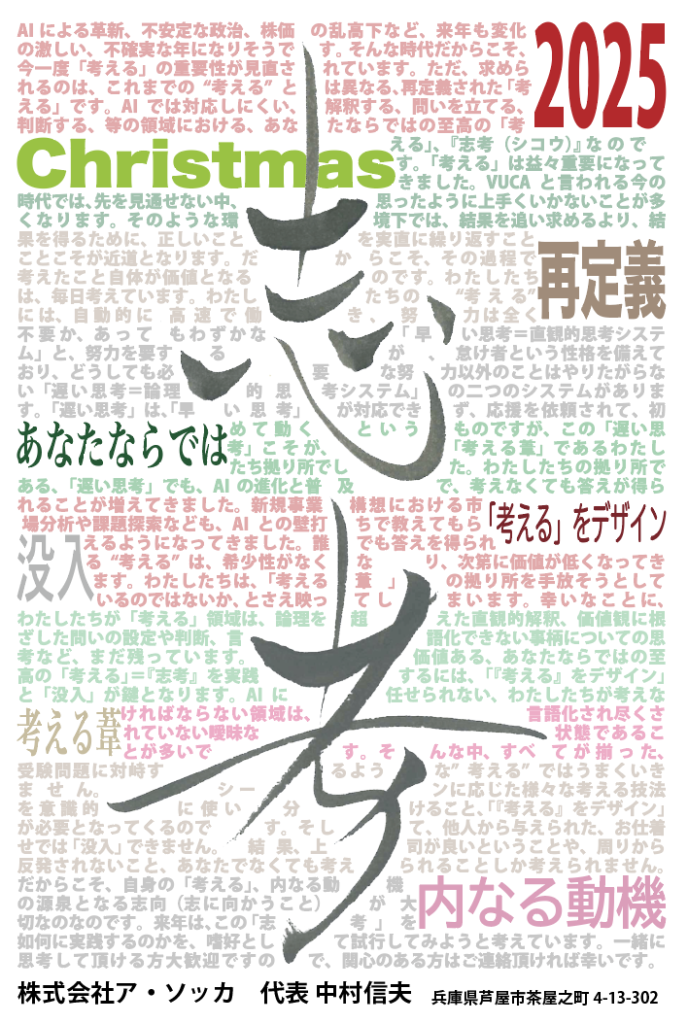 トピックスTopic:クリスマスカードをお送りしました(2025.12.17)2025.12.20日頃お世話になっている方々に、2025年のクリスマスカードをお送りしました。 今年のコンセプトは「志考」です。 初心に帰って、「考える」とは何かを提案させて頂きました。 2026年が皆さまに …